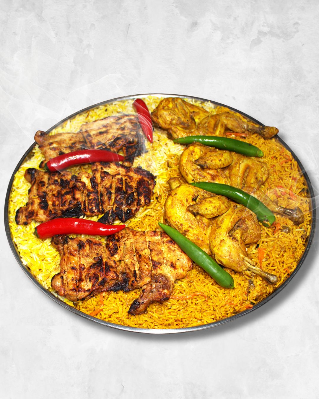 صينية مكس دجاج عادي ومشوي على الفحم مع رز بخاري وبرياني 6 - 7 اشخاص